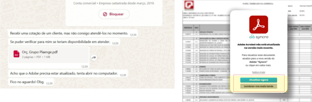 Users receive messages from trusted WhatsApp contacts containing malicious PDF or HTA attachments.