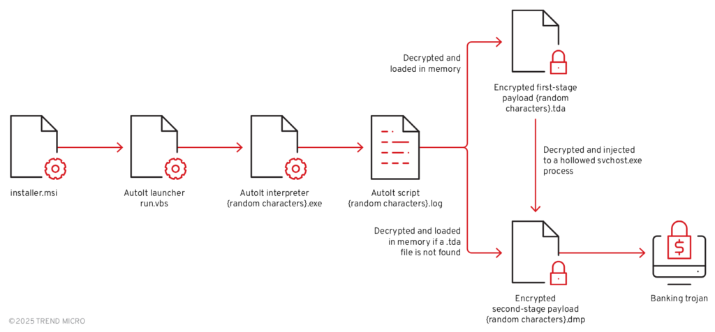 The MSI installer deploys the banking trojan using AutoIt scripts. These scripts