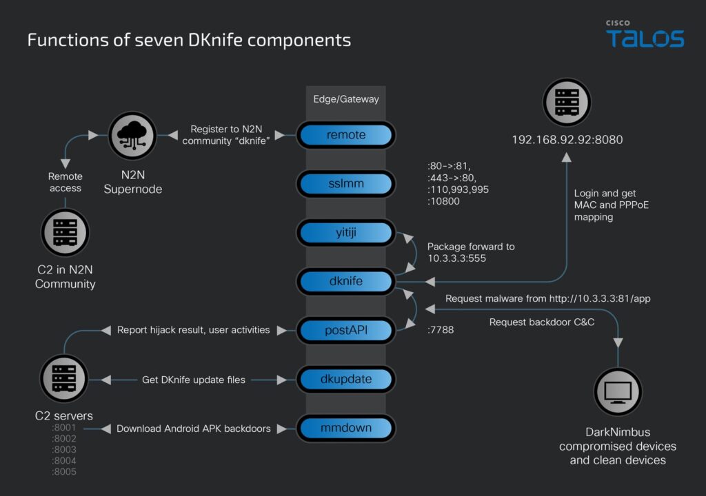According to a report published by Cisco Talos, DKnife consists of multiple Linux-based implants that perform deep packet inspection, manipulate network traffic, and hijack software updates to deploy malicious payloads. Evidence suggests that the framework primarily targets Chinese-speaking users.