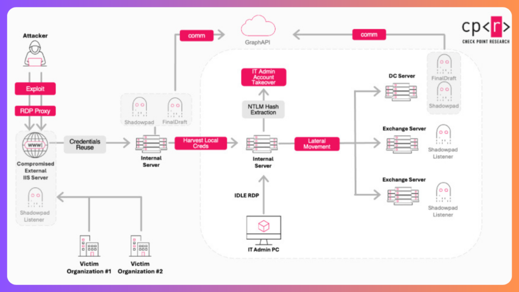 Ink Dragon has also been observed exploiting ToolShell SharePoint vulnerabilities to deploy web shells. Additional post compromise activity includes lateral movement via stolen administrative credentials, persistence through scheduled tasks and services, credential harvesting from LSASS memory, registry hive extraction, and firewall rule manipulation to enable outbound traffic.