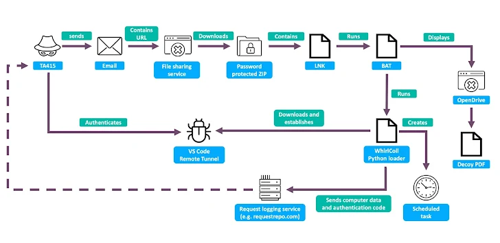 Proofpoint pointed out that this infection chain closely resembles a September, 2024 attack that targeted organizations in aerospace, chemicals, insurance, and manufacturing, where the Visual Studio Code Remote Tunnels mechanism was also used via a Python loader. The recurrence suggests the actor continues to refine a reliable toolset for long term access and data theft.