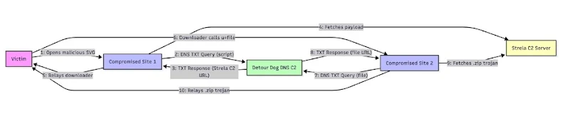 - A second compromised domain repeats the same process, fetching the malware from another Strela C2 server and delivering it to the target system.