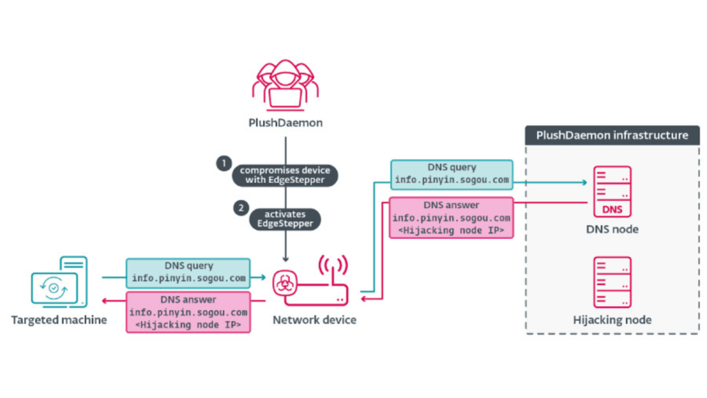 A China aligned threat actor known as PlushDaemon has been identified using a new Go based network backdoor called EdgeStepper. This tool enables adversary in the middle attacks by hijacking DNS queries and redirecting them to malicious infrastructure. Through this method, attackers can compromise legitimate software update channels and deliver harmful payloads.