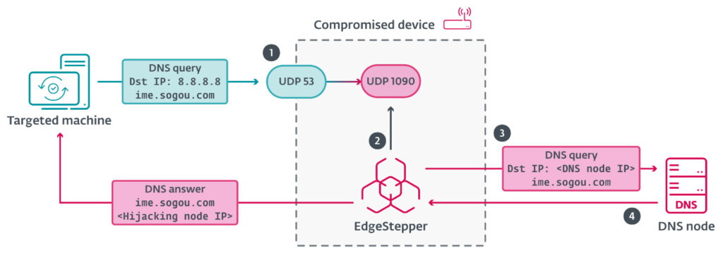 After activation, EdgeStepper reroutes DNS queries to a malicious DNS server. That server checks whether the requested domain is associated with software updates. If it is, the server responds with the IP address of the hijacking node. In some cases, the same machine acts as both the DNS and hijacking node and responds directly with its own IP address.