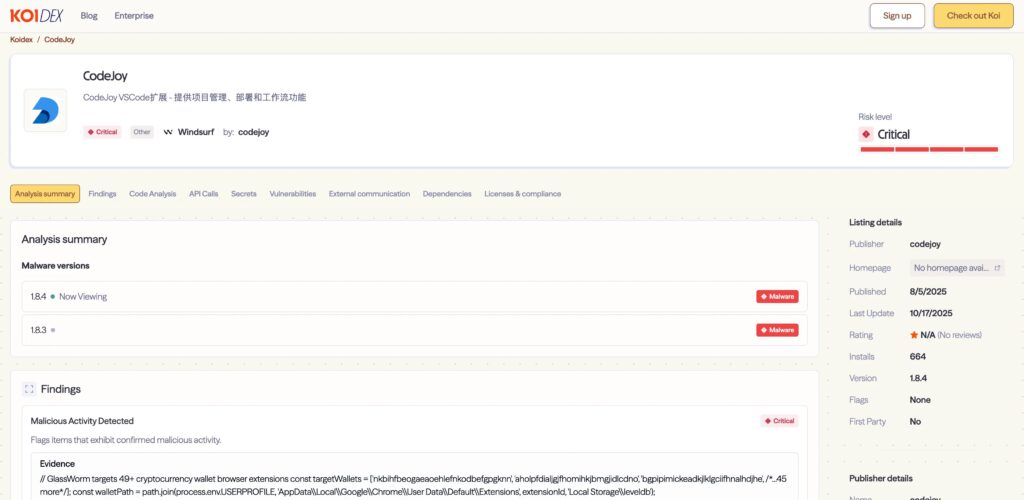 GlassWorm does more than steal credentials—it infiltrates developer machines at a deep level. The first signs appeared when Koi researchers noticed unusual behavior in the seemingly harmless “CodeJoy” extension after version 1.8.3 was released.