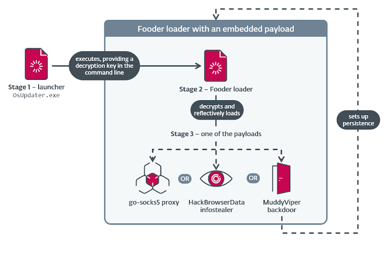 The MuddyViper backdoor is executed through a loader named Fooder, capable of decrypting and running C/C++ code. Fooder variants also deploy go-socks5 reverse tunnels and HackBrowserData utility to steal browser data, except Safari on macOS.