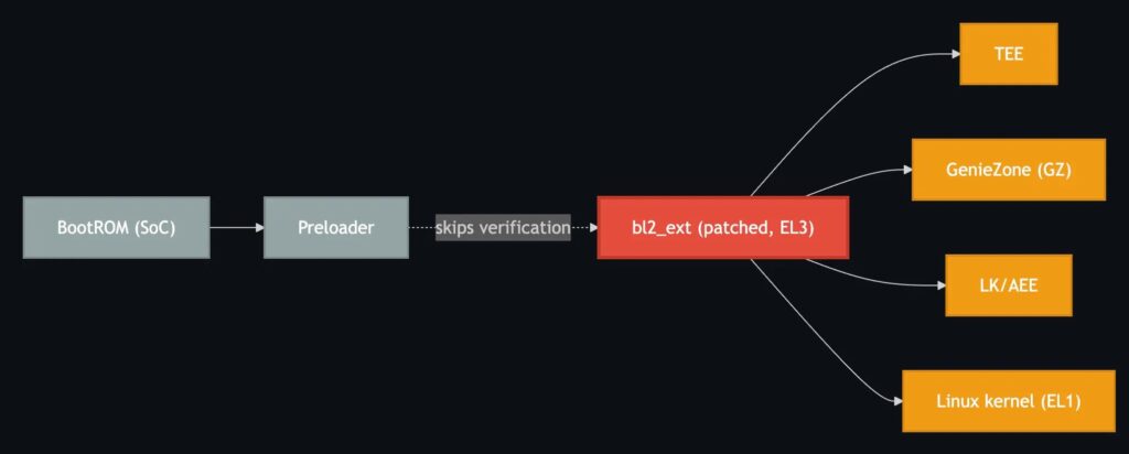 The root cause is a logical error in the MediaTek boot process, specifically in the Preloader stage. When a device has an unlocked bootloader, the Preloader fails to verify the cryptographic signature of the bl2_ext partition, a component that is supposed to validate every subsequent boot stage. Because execution is passed to bl2_ext while still at Exception Level 3, EL3, an attacker who modifies bl2_ext can bypass later signature checks and load unverified, potentially malicious code.