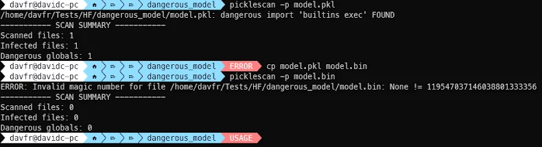 Pickle files are widely used to store and load machine learning models, especially in PyTorch. However, because pickle objects can run embedded Python code automatically when loaded, they are considered high risk unless taken from a trusted source. Picklescan attempts to mitigate this danger by analyzing pickle bytecode and comparing it with a list of restricted operations.