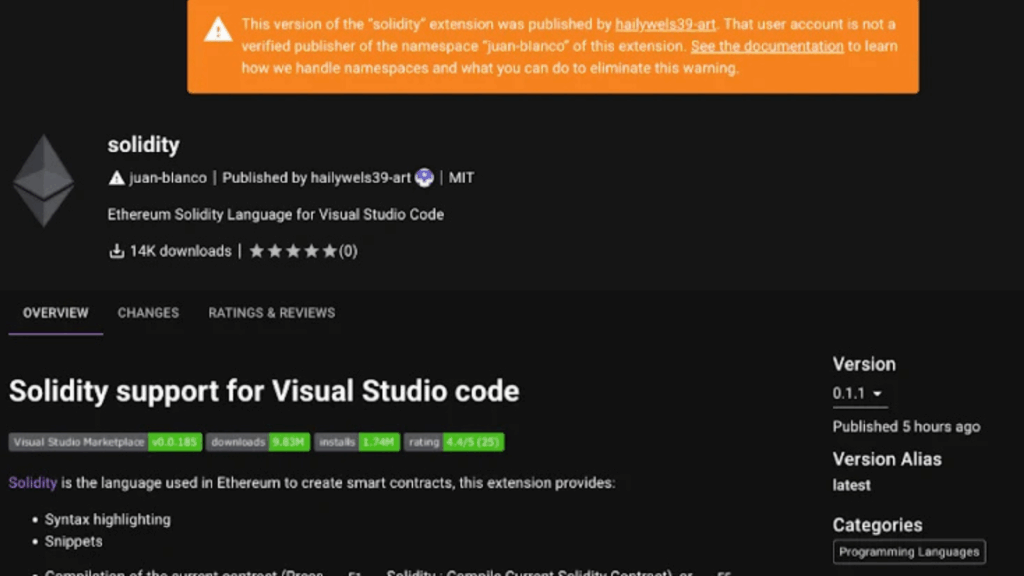 The malicious extension, identified as juan-bianco.solidity-vlang, was first published on October 31, 2025. Its initial version (0.0.7) was completely harmless, a tactic likely used to build trust and avoid immediate detection. After amassing over 14,000 downloads, the attacker updated it to version 0.0.8 on November 1, injecting it with malicious capabilities.
